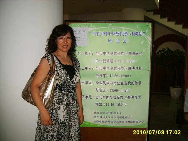 2009年7月第十六届国际人类学民族学大会“法律人类学”专题会议 中国人民大学法律与宗教研究中心成立大会 2009年10月中国人民大学“多元纠纷解决机制研究中心成立大会”与范瑜教授、冯玉军教授合影 2010年7月参加“当代中国少数民族习惯法”研讨会 2012年6月参加中央民族大学新增基本科研业务费重大项目“民族政策法规体系实践经验的总结和反思”开题报告评审会 2012年7月参加教育部少数民族双语教育研究会与张强司长和苏丽蓉主任合影 2012年11月民族法学年会参加西南民族大学“西部法律人才教育培养基地建设启动仪式” 2012年11月民族法学年会参加西南民族大学庆祝彝族新年和十八大文艺晚会