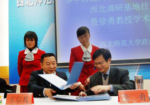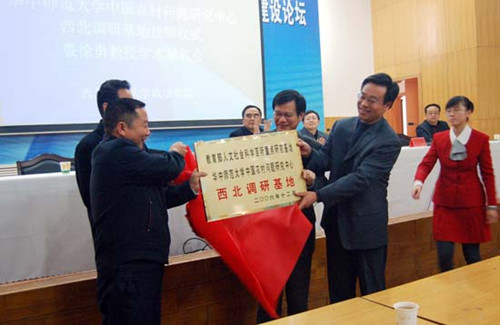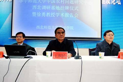 首先,王利民校长致辞,肯定了两校长期在学术、科研领域内的交流与合作,对华中师范大学在我校设立中国农村问题研究中心西北调研基地表示感谢,同时也对徐勇教授和石挺教授来我校表示热烈的欢迎。接着由华中师范大学社科处处长石挺处长和我校副校长邓华陵研究员分别宣读了华中师范大学关于设立“教育部人文社会科学百所重点研究基地华中师范大学中国农村问题研究中心西北调研基地”的决定和西北师范大学关于设立“教育部人文社会科学百所重点研究基地华中师范大学中国农村问题研究中心西北调研基地”的决定。