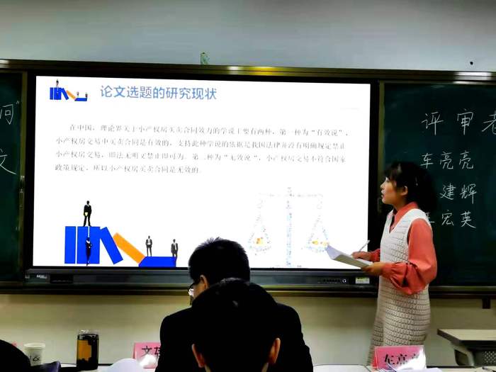 第二会场在303室进行,由2020级法律硕士研究生高晨同学主持,共七位研究生分别进行了论文答辩。其中马晓波同学的论文题目是《论网络暴力的治理困境与法律规制》,贺迪同学的论文题目是《分析实证主义法学的哲学基础》,刘亚鑫同学的论文题目是《占有概念刍议》,张星星同学的论文题目是《执行难的原因及对策探究》,齐雨彤、刘晓琳同学的论文题目是《我国劳务派遣中的劳动者权益保护》,陈长久同学的论文题目是《论故意伤害致死案件中因果关系认定视角下的保辜制度》,戚畅同学的论文题目是《经济发展水平与刑事案件类型的关联性探究》。现场答辩的每一位同学热情饱满,对自己的论文进行了详细的讲解,参与评审的老师也分别针对每一位同学耐心详细的指出了他们论文的不足与优点,同时现场旁听的同学也积极参与到答辩当中,提出了自己的疑问和看法。