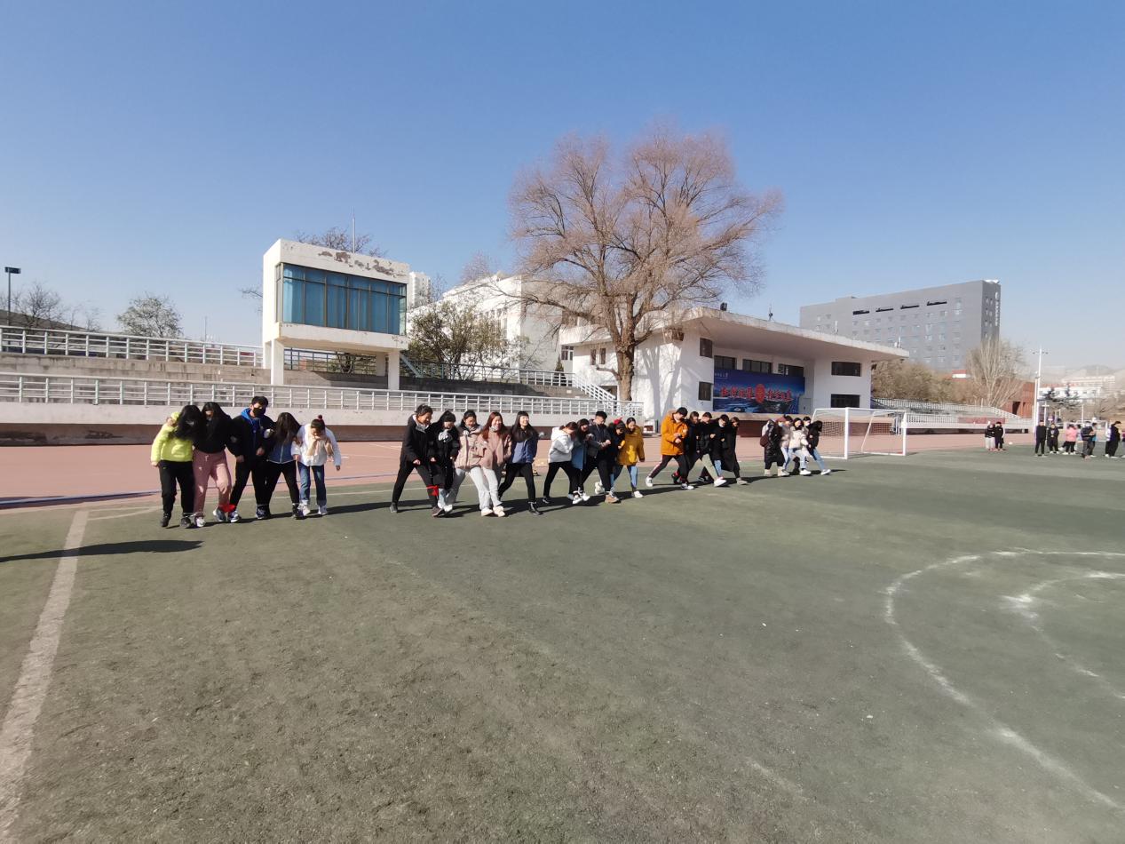 第二项“齐头并进,协力共赢”五人四足绑腿行走比赛中,同样也是每组5人,在比赛行走的50米中,同学们必须齐心协力,通过彼此之间的默契配合才能又快又稳的到达终点,其中关键所在就是要求每组队员保持一样的步伐频率,只有当每名队员的步伐频率一致时才能使团队整体保持平衡前进。最终,张曜、谷晓艺等5名同学取得本次比赛第一名。