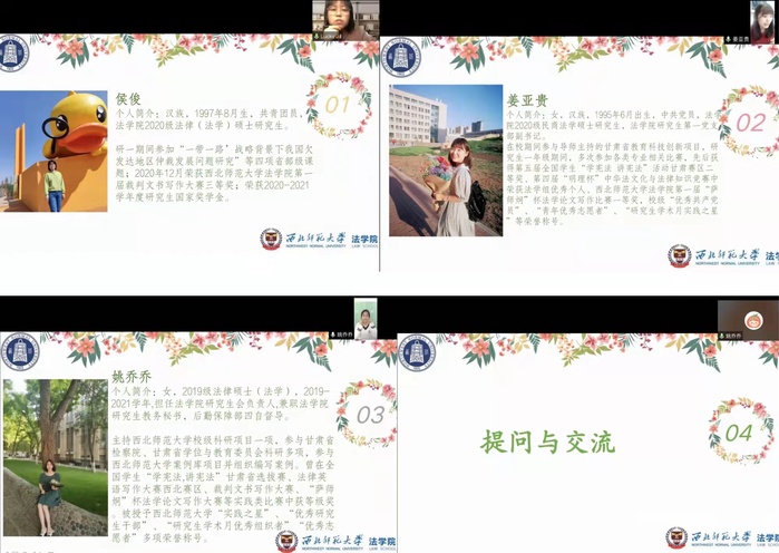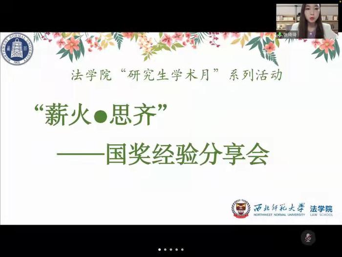 本次国奖分享会,首先由主持人张琦琦介绍了会议的流程和分享者的优秀经历。侯俊同学从参加课题、论文写作、学习心得三个方面进行分享,侯俊同学相信“每一棵树都想要开花”,以此鼓励同学们把握机会、积极参加课题研究;她认为应该从案例出发确定题目或者用案例反向支撑观点,多读核心期刊、按具体问题或者按篇章来撰写文献综述,推荐了何海波老师的《法学论文写作》和梁慧星老师的《法学学位论文写作方法》两本书目。姜亚贵同学先介绍了国家奖学金、学业一等奖学金等开云奖学金基本情况和评定方法,然后主要从认识到认真完成学位论文的重要性、实践主义法学研究的相关理论、论文阅读方法、观察体会是法科论文撰写的开端、收集实践材料要有问题意识、保持严谨观点展开论述,六个方面解答了如何进行论文写作;最后,她建议同学们充分利用时间去拓宽知识面、确定目标付出实践等。姚乔乔同学首先分享了可以通过远离诱惑高效管理时间、将任务拆解分析逐步完成、运用时间记账法、尝试“三秒钟”经典法则和制定一个短期可执行目标来帮助形成自律习惯、提升自己;之后,她提出写出一篇论文主要有选择好的题目、检索收集文献找到创新点形成文献综述、借鉴模仿优秀行文结构三个关键点;最后姚乔乔同学鼓励同学们在学好专业知识的同时,培养自己的兴趣爱好。