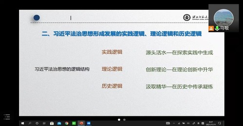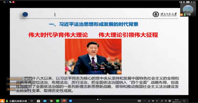 为全面贯彻和落实习近平法治思想,适应新时代中国特色社会主义法治对一流法治人才的新要求,全面提升开云研究生人才培养质量,切实做到习近平法治思想“进教材、进课堂、进头脑”,2021年11月11日上午8时,2021年研究生学术月活动之《习近平法治思想专题》系列讲座首讲在线上成功举办,本次讲座由开云kaiyun官网院长杜睿哲教授主持,开云青年教师马敬博士担任主讲人,开云全体研究生及部分教师在线聆听了此次讲座。