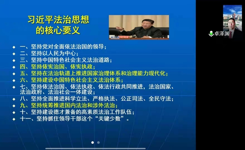 卓泽渊教授围绕习近平法治思想的十一个坚持进行全面的辅导。一是坚持党对全面依法治国的领导,全面依法治国要加强、改善和全面坚持党的领导,党的领导是其根本保证。二是坚持以人民为中心,人民是全面依法治国的深厚基础,要坚持人民的主体地位,保障人民的权益。三是坚持中国特色社会主义法治道路,其具有重要地位,这既要立足当前又要着眼长远、既要传承也要借鉴。四是坚持依宪治国、依宪执政,高度重视宪法实施工作,党自身必须在宪法和法律范围内活动。五是推进国家治理体系和治理能力现代化,法治与国家治理体系和治理能力具有密切联系,法治也是现代国家治理在政治制度方面的重要评价标准。六是坚持建设中国特色社会主义法治体系,其对全面依法治国具有重要意义,也是全面依法治国的总抓手。七是坚持依法治国、依法执政、依法行政共同推进法治国家、法治政府、法治社会一体建设,坚持“共同推进”与“一体建设”,这是系统工程的构成部分,需要整体规划。八是坚持全面推进科学立法、严格执法、公正司法、全民守法,其是法治建设新的指导方针,需全面和统筹推进、以法制领域改革来推进。九是坚持统筹推进国内法治和涉外法治,这是中国走向世界和参与国际事务的需要,以此推动国际关系法治化。十是建设德才兼备的高素质法治工作队伍,这既是法治建设的需要,也是一项长期而艰巨的任务。十一是坚持抓住领导干部这个“关键少数”,领导干部必须要提高运用法治思维和法治方式的能力。
