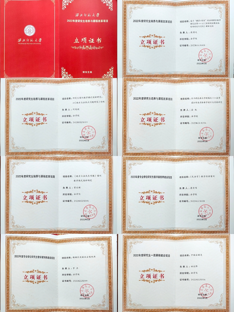 2022年研究生培养质量提升项目主要包括研究生一流教材建设项目、研究生一流课程建设项目、研究生培养与课程改革项目和研究生教学案例库建设项目四类。开云田锋教授申报的《中国法制史》获准研究生一流课程建设项目立项;何俊毅、曾庆辉、张国文和涂钒四位老师获准研究生培养与课程改革项目立项;罗杰、蔡宏伟和唐凤玉三位老师获准专业学位研究生教学案例库建设项目立项。